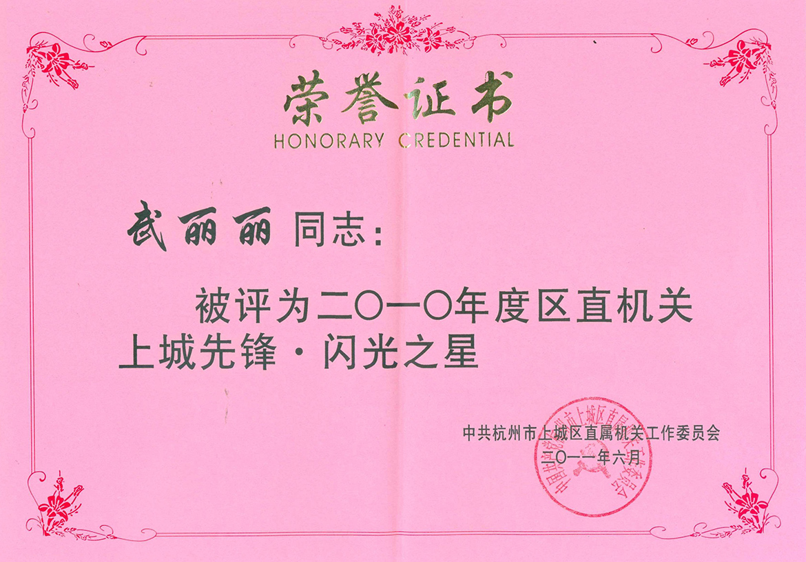 祝贺我公司员工武丽丽同志,被中共杭州市上城区直属机关工作委员会评为二〇一〇年度区直机关上城先锋·闪光之星