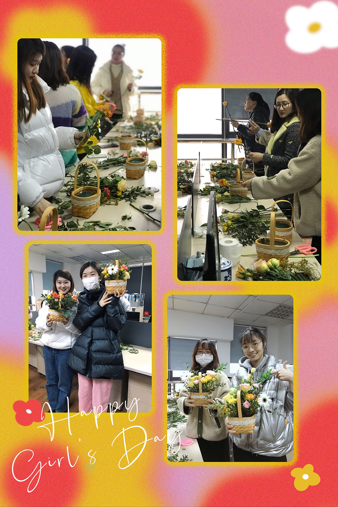 “女神”节到来,公司特意组织了插花,插花是一种高雅脱俗的艺术活动,它不仅可以美化环境、点缀气氛,还可以提高品位与素养。经验丰富的花艺师讲解了花的花语和插花流程,女同胞们就纷纷动起手来,每个人凭借对美的不同理解,认真的修剪枝叶、设计造型,一篮篮错落有致、色彩鲜艳、造型优美的插花作品就展现在了大家面前。每个人捧着自己亲手制作的作品,反复欣赏着,跟自己的作品合影,一个个脸上洋溢着幸福感和成就感。