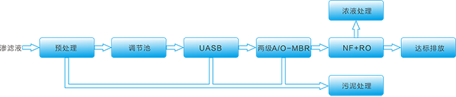 主体工艺:预处理+UASB+两级A/O-MBR+NF+RO