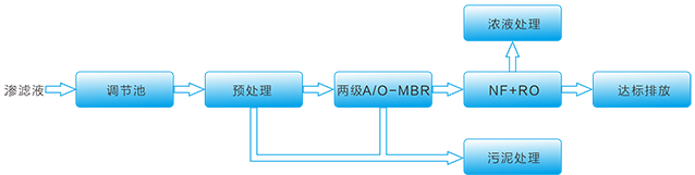 渗滤液由调节池均匀水质水量后,提升经预处理系统去除悬浮物预处理后进入外置MBR系统。MBR系统由二部分组成,两级A/O生化系统和外置管式超滤膜系统。MBR膜生物反应出水深度处理系统,其由NF和RO处理系统组成,经深度处理后,达标排放。