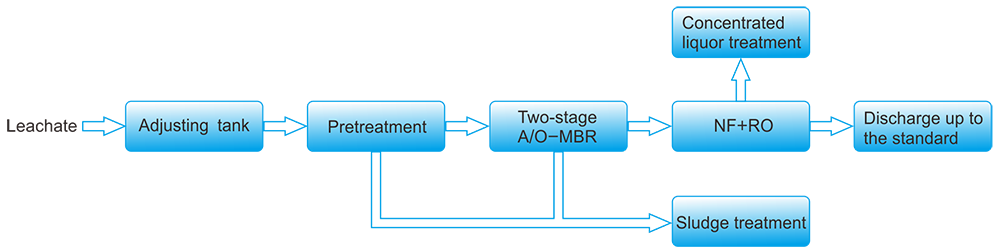The quality and quantity of the leachate is adjusted by regulating tank,then enter into the external MBR system after the pre-treatment system to removal suspended particles. The MBR system consists of two parts: two-stage A/O biochemical system and the external tubular ultrafiltration membrane system. The effluent of MBR membrane bio-reactor enter into the depth treatment system,which is composed of NF and RO system; leachate can reach the emission standard after the depth treatment.